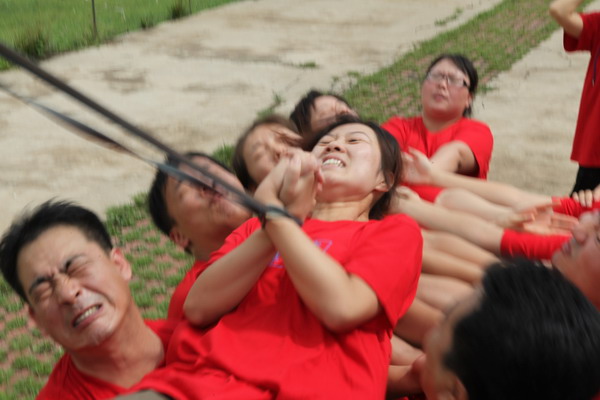 活動中,全體參訓人員分成了“ super16 ”、“火紅傳奇”和“筑夢” 3 個小組,在小組教練的帶領下開始“信任背摔”、“合力橋”、“雷陣”等項目的拓展訓練。按照要求,每個小組都選取了隊歌、制定了口號,為自己的小隊增添力量。每項拓展活動開始前,小組全體成員一起開動腦筋,精心設計方案;活動進行過程中,小組成員互相鼓勵,互相幫助,齊心協力完成項目;每個項目結束后,小組成員互相交流討論,分享在訓練中的心得。最后,全體人員在互相鼓勵協作下,全部翻越畢業墻,順利完成拓展任務。