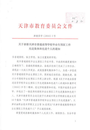 我校2010年畢業生預征工作,在學校黨委、行政的正確領導下,按照市教委工作要求,精心部署,認真落實,取得良好成績,共有57 名學生入伍預征,居全市高校之首。 我校武裝部被評為“天津市普通高等學校畢業生預征工作先進集體”,孟國棟老師被評為“天津市普通高等學校畢業生預征工作先進個人”。