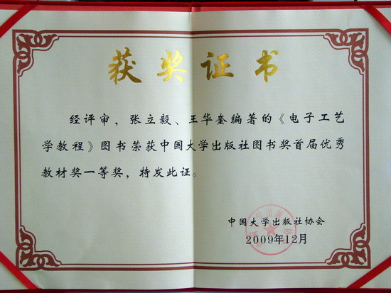 《電子工藝學教程》榮獲的優秀教材一等獎獎狀