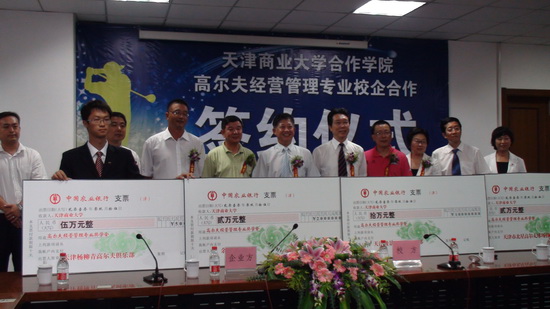9月15日,在圖書館二樓會(huì)議室,高爾夫經(jīng)營(yíng)管理專業(yè)客座教授聘任儀式,校企合作、實(shí)踐教學(xué)基地授牌儀式,獎(jiǎng)學(xué)金捐贈(zèng)儀式隆重舉行。校黨委書記陳學(xué)奇、校長(zhǎng)劉書瀚、 天津市駿景高爾夫俱樂部有限公司總經(jīng)理鄧洪青、天津市楊柳青高爾夫俱樂部總經(jīng)理張強(qiáng)、天津市北星高爾夫球場(chǎng)管理有公司總經(jīng)理王清明、深圳朝向管理集團(tuán)管理事業(yè)部總經(jīng)理余榮熙、教務(wù)處長(zhǎng)于義良、合作學(xué)院領(lǐng)導(dǎo)王文君、羅慶豐、王雷及相關(guān)教師出席,在校的2008級(jí)、2010級(jí)高爾夫經(jīng)營(yíng)管理專業(yè)全體學(xué)生參加。