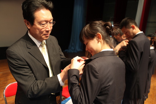 專業教師代表Mohammad Qureshi教授在典禮上也對同學們的未來學習提出了要求;其后,雙方領導為獲得萬豪獎學金、托福高分獎以及在某個領域做出成績的的同學頒發獲獎證書,并為08級學生佩戴FIU校徽;最后,08級學生代表與10級新生代表分別做了發言,他們表達了自己進入合作學院學習的激動心情,并表示要以百倍的努力回報學校領導與老師們對他們的培養,在學習和生活中不斷成長與完善自我,成為品學兼優的酒店業優秀人才 。