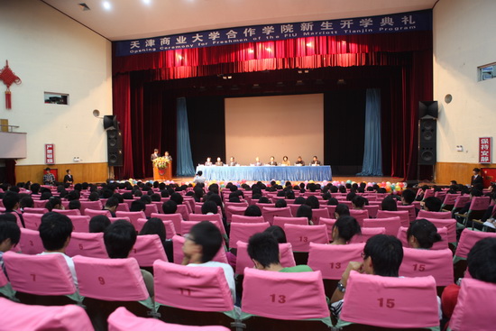 9月14日下午兩點,合作學院在科學會堂舉辦了隆重的新生開學典禮。美國佛羅里達國際大學(以下簡稱 FIU )酒店與旅游管理學院院長Joan Remington 博士、助理院長Mohammad Qureshi 教授、項目總監盧朋博士、萬豪國際酒店集團天津萬豪行政公寓總經理Steven You 先生和天津商業大學校長劉書瀚博士、國際教育學院院長寇小萱博士、教務處于義良處長、合作學院羅慶豐副書記,以及 FIU 的專業教師和合作學院全體教師參加了此次典禮。典禮由合作學院院長王文君博士主持。