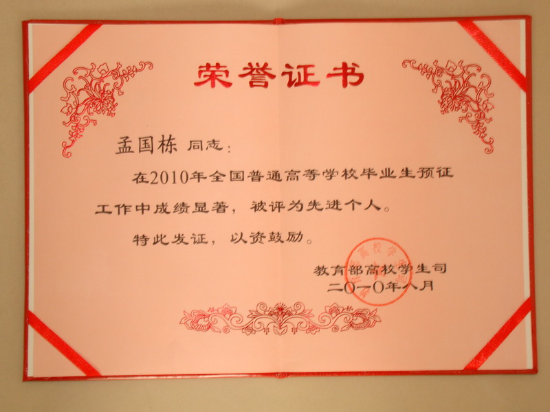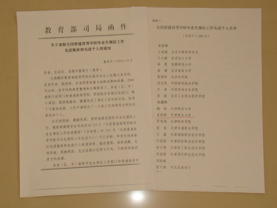 我校2010年畢業生預征工作,在學校黨委、行政的正確領導下,按照市教委工作要求,精心部署,認真落實,取得良好成績,繼校武裝部被評為“天津市普通高等學校畢業生預征工作先進集體”,孟國棟老師被評為“天津市普通高等學校畢業生預征工作先進個人”之后,孟國棟老師又獲得“全國普通高等學校畢業生預征工作先進個人”榮譽稱號。