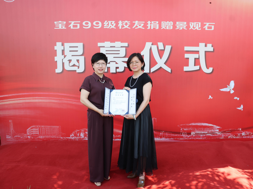 儀式期間,王立云與校友代表韓昭共同為“琢玉”景觀石揭幕,并為他們頒發了捐贈證書。景觀石坐落于青年湖東側,毗鄰青年湖,同時與周邊綠樹花草相映成趣,為校園平添幾分雅致。