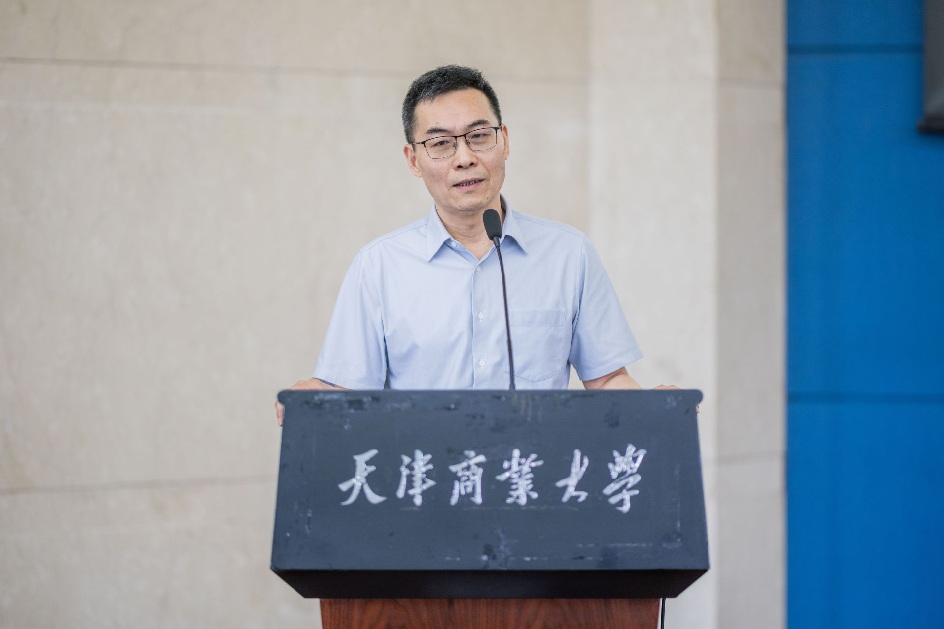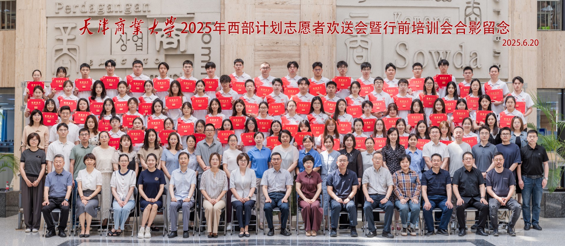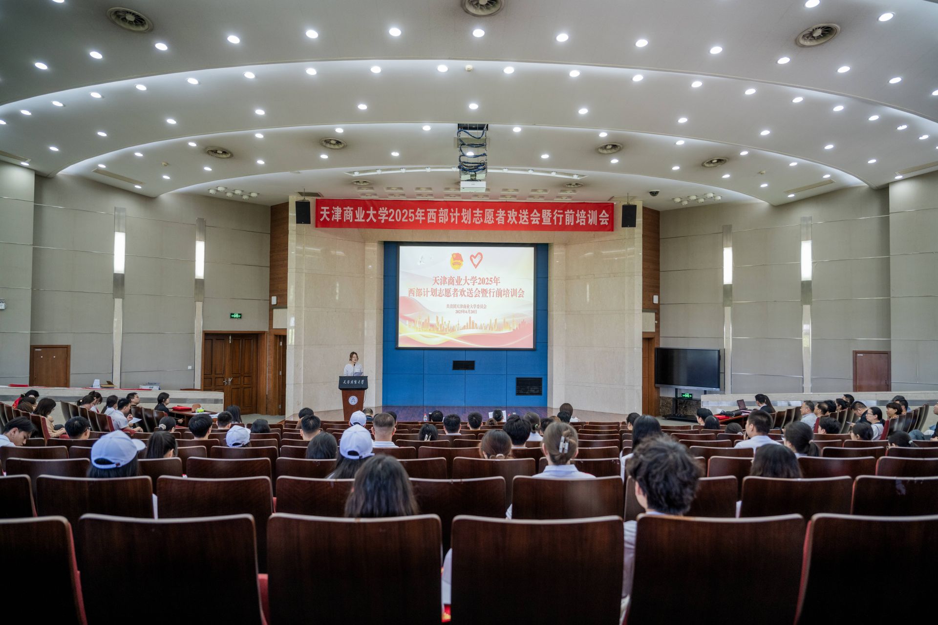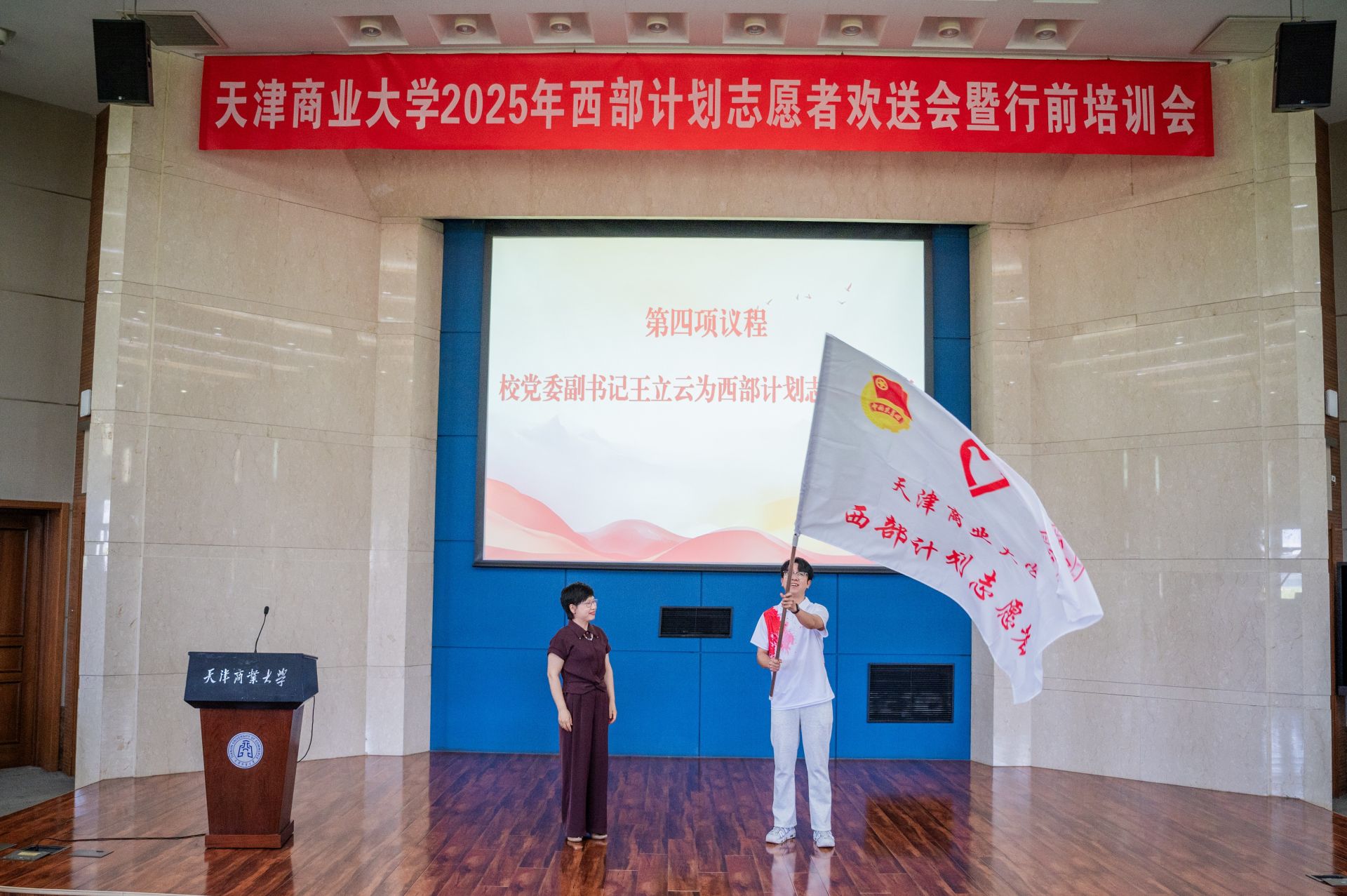 王立云向西部計劃志愿者授旗,相關職能部門負責人為西部計劃志愿者代表頒發優秀畢業生榮譽證書,全體參會人員觀看了西部計劃宣傳片——《從天商出發,讓青春在西部閃光》。