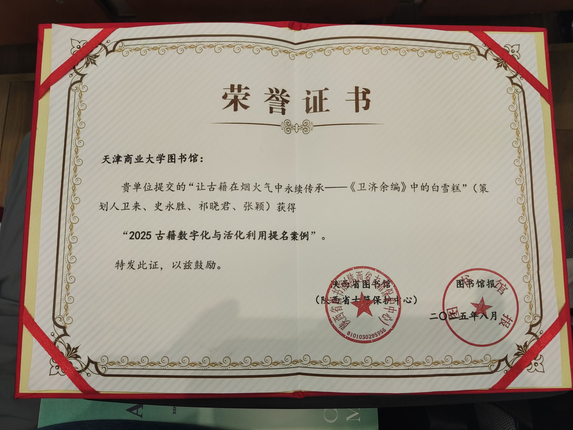 近日,由國家古籍保護中心指導(dǎo)、陜西省圖書館(陜西省古籍保護中心)主辦、《圖書館報》承辦的“2025年度古籍?dāng)?shù)字化與活化利用會議”在西安舉行。天津商業(yè)大學(xué)圖書館報送的案例“讓古籍在煙火氣中永續(xù)傳承——《衛(wèi)濟余編》中的白雪糕”榮獲2025年度古籍?dāng)?shù)字化與活化利用提名案例。