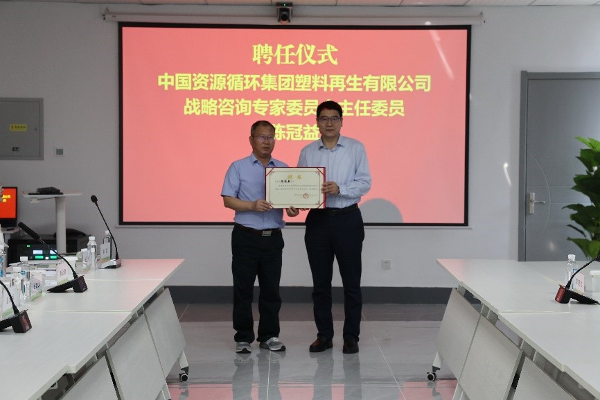 為深化合作,中國資源循環集團塑料再生有限公司特聘請陳冠益擔任公司戰略咨詢專家委員會主任委員。座談會上,舉行了聘任儀式,劉春祥為陳冠益頒發聘書。