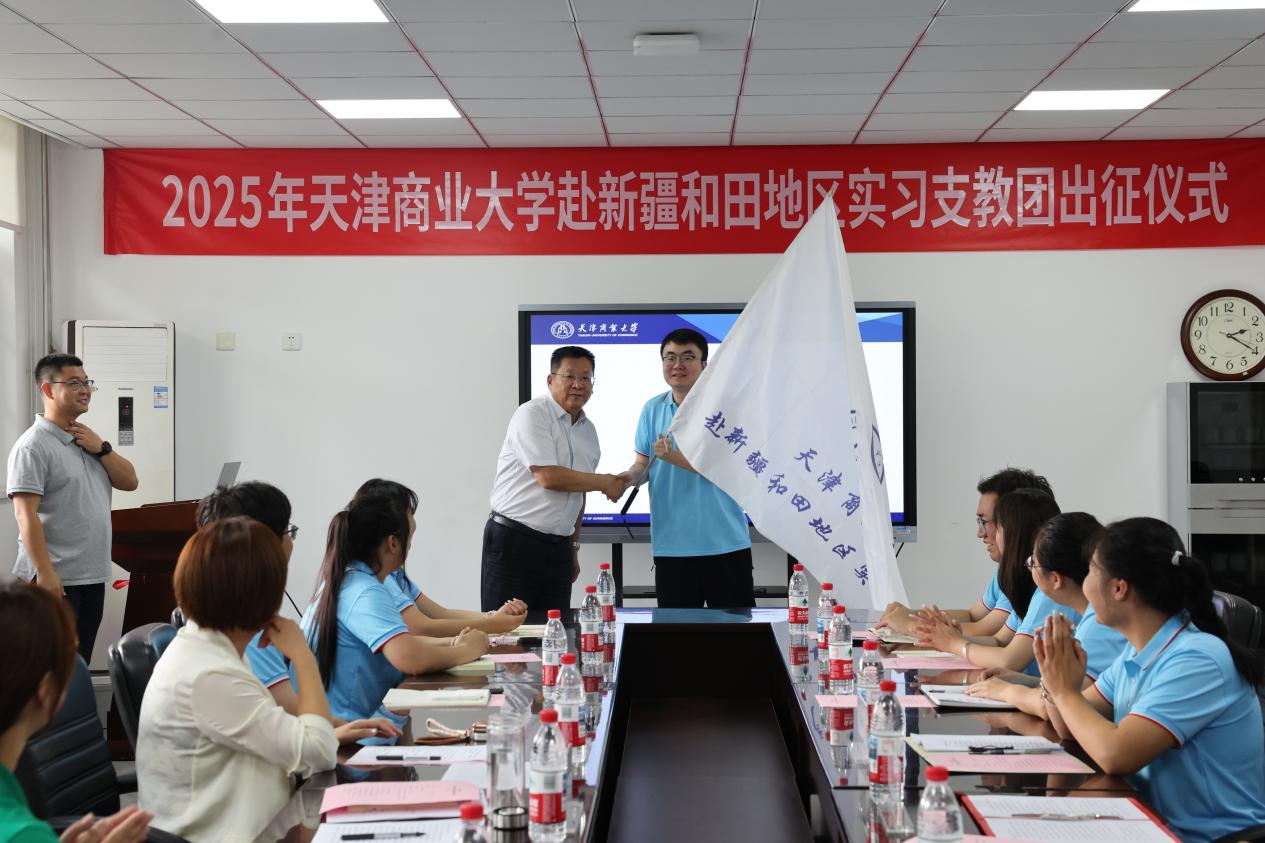 9月15日下午,天津商業(yè)大學(xué)赴新疆和田地區(qū)實(shí)習(xí)支教團(tuán)出征儀式在行政樓多功能會(huì)議室舉行。副校長(zhǎng)齊恩平教授出席并向?qū)嵙?xí)支教團(tuán)授旗。黨委學(xué)工部、團(tuán)委負(fù)責(zé)同志,相關(guān)學(xué)院黨委副書記,2024年實(shí)習(xí)支教團(tuán)師生代表和2025年實(shí)習(xí)支教團(tuán)全體師生參加。會(huì)議由黨委學(xué)工部主要負(fù)責(zé)同志主持。